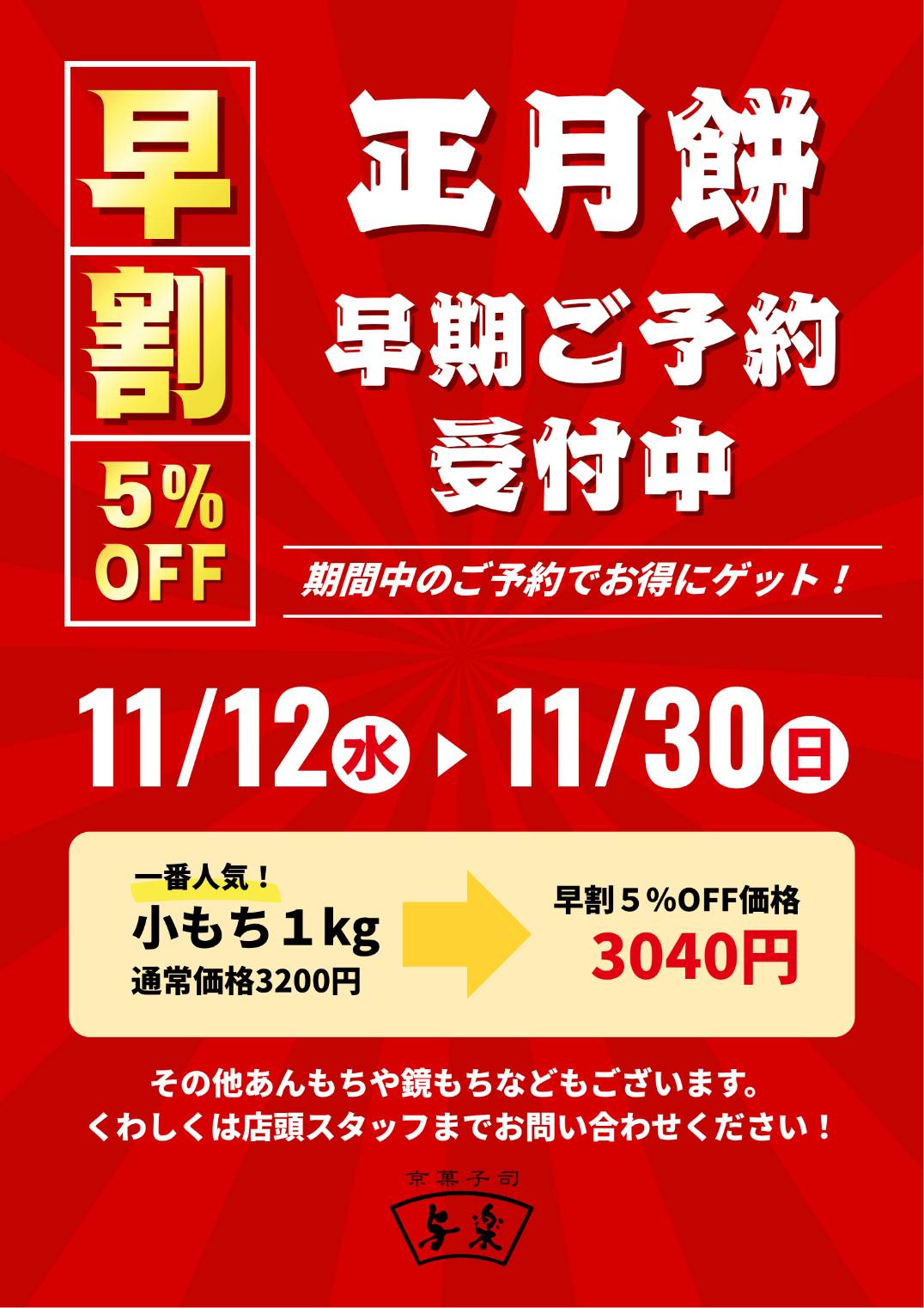 11月12日から11月30日までのご予約で、おもち全品が通常価格より5%OFF!